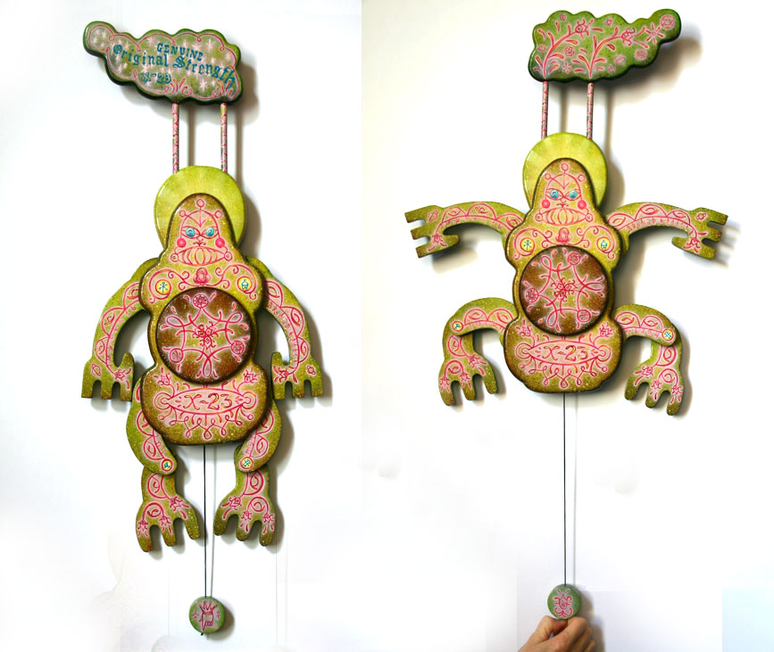 X-23 standing and jumping, this is from the 2005 exhibition, Calling all RobotsĀ at Idiom Gallery, Cuba St, Wellington. X-23 is one of 14 tiki robots from that show.