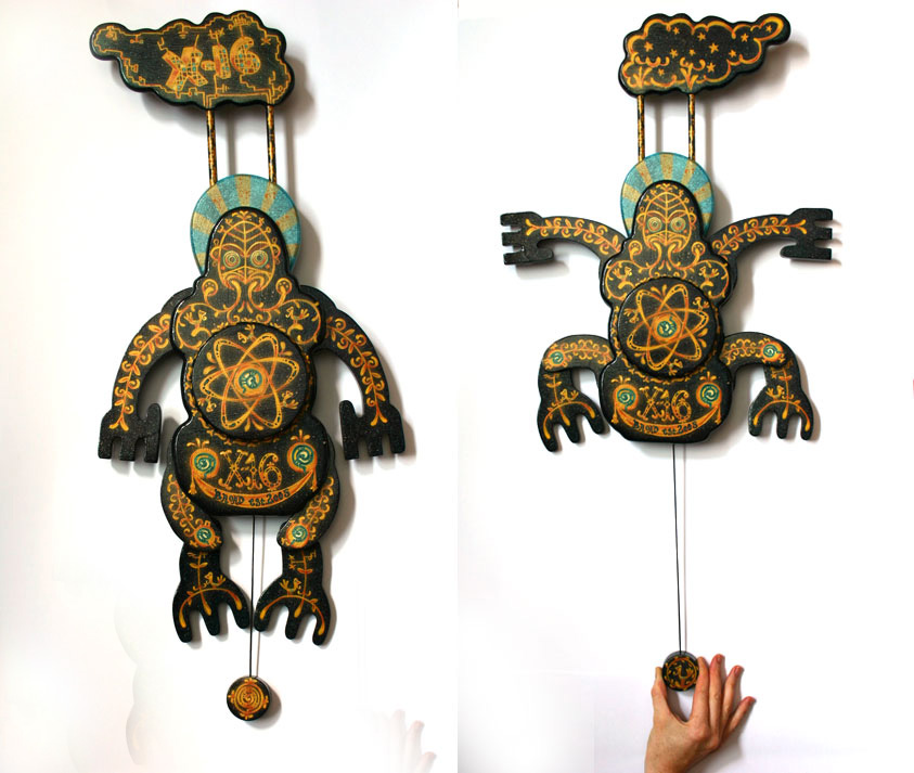 X-16 standing and jumping, this is from the 2005 exhibition, Calling all RobotsĀ at Idiom Gallery, Cuba St, Wellington. X-16 is one of 14 tiki robots from that show.
